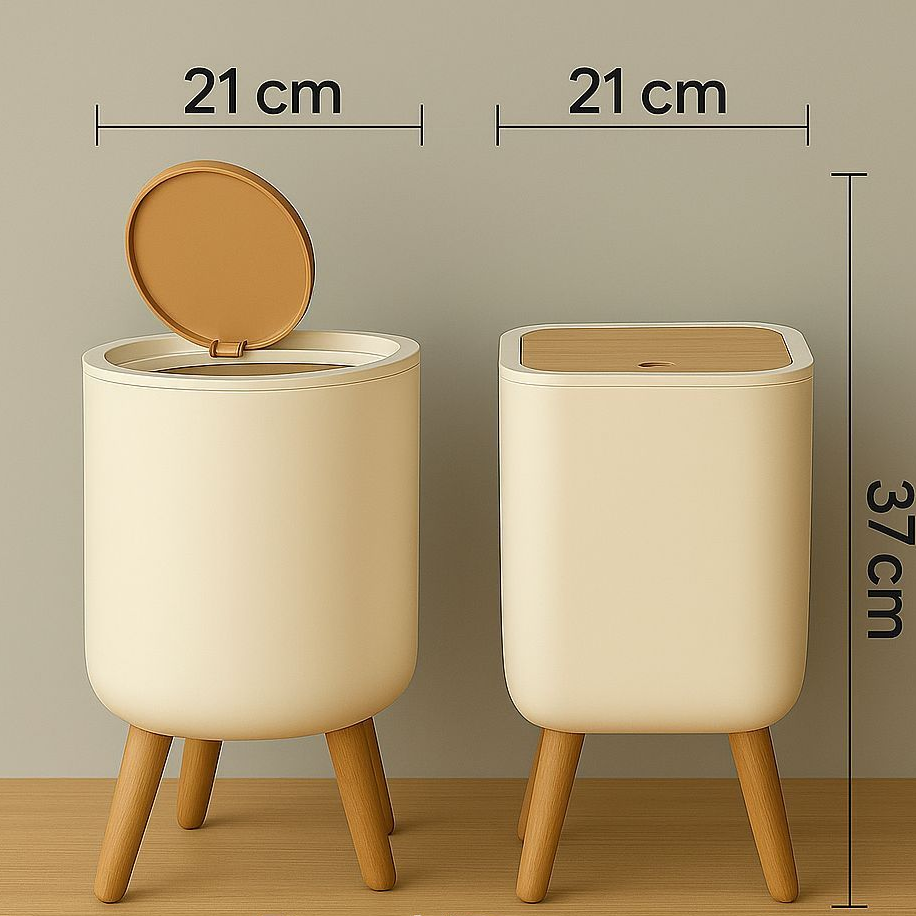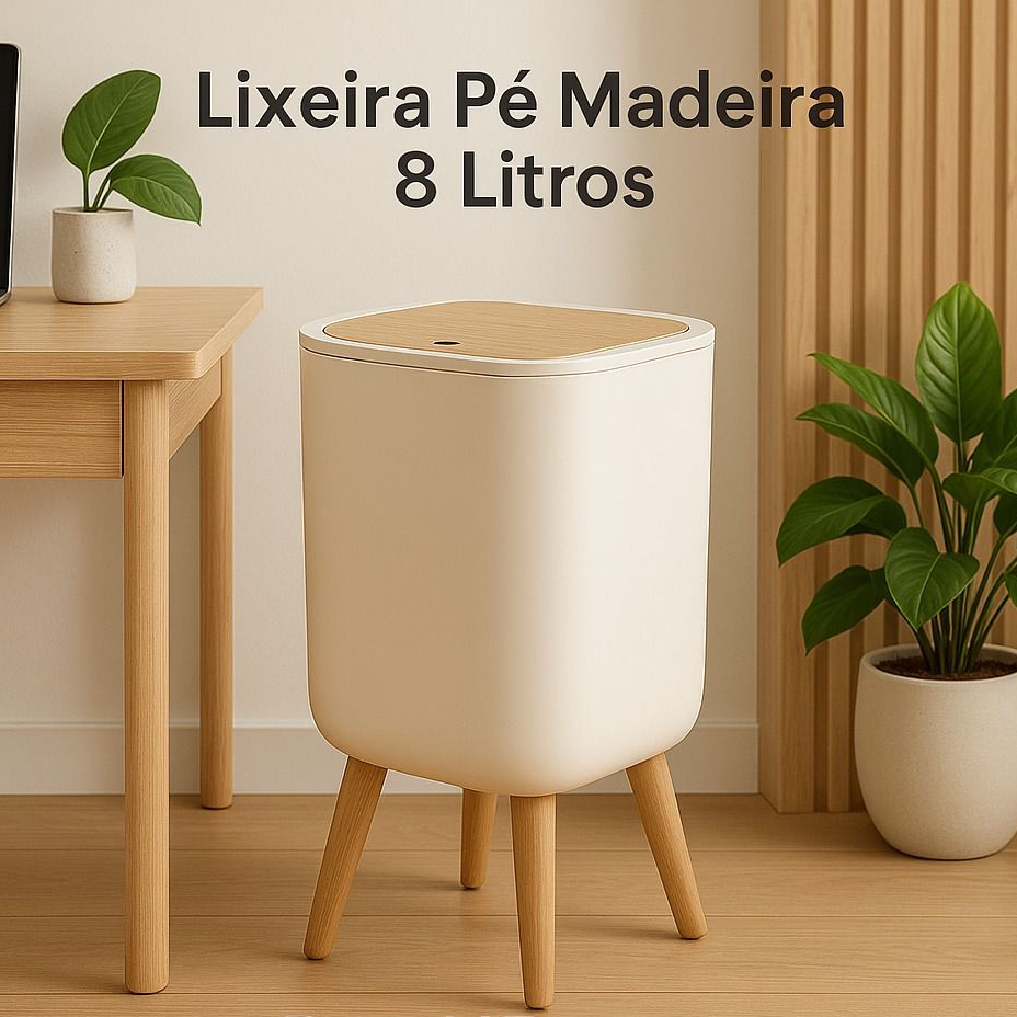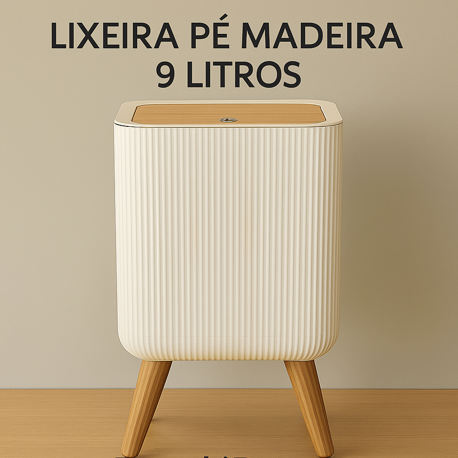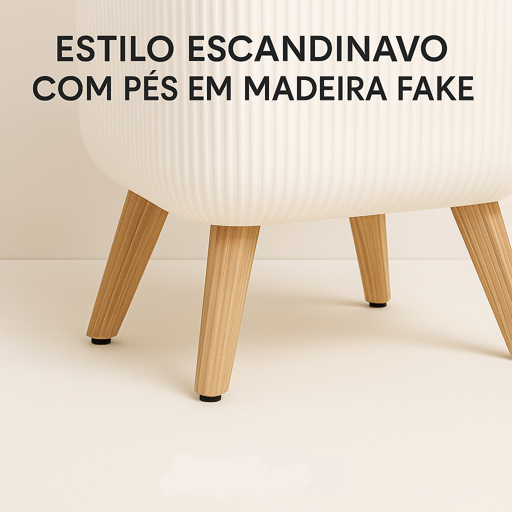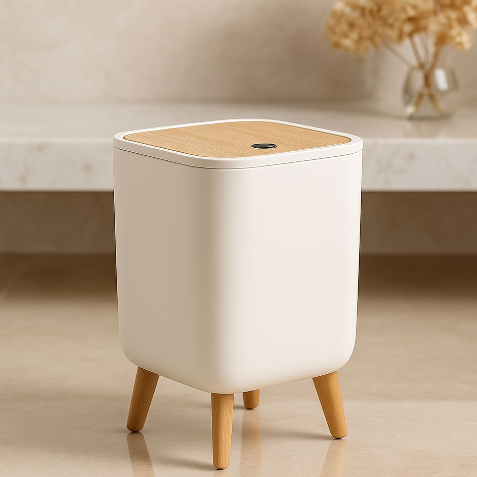 Fabricada em plástico de alta qualidade, resistente e fácil de limpar, a lixeira possui base com pés em acabamento que remete ao bambu, criando um contraste elegante entre o branco minimalista e o visual natural da base.